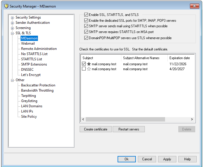 A third party or self-signed certificate must exist in the server's certificate store to use SSL, STARTTLS, and STLS. The use of a self-signed certificate is not recommended.