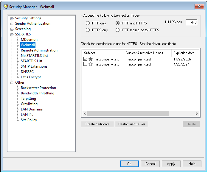 You may use the same certificate above for secure Webmail connections over HTTPS. HTTPS only and HTTP redirected to HTTPS will disable non-SSL connections from occurring for Webmail.