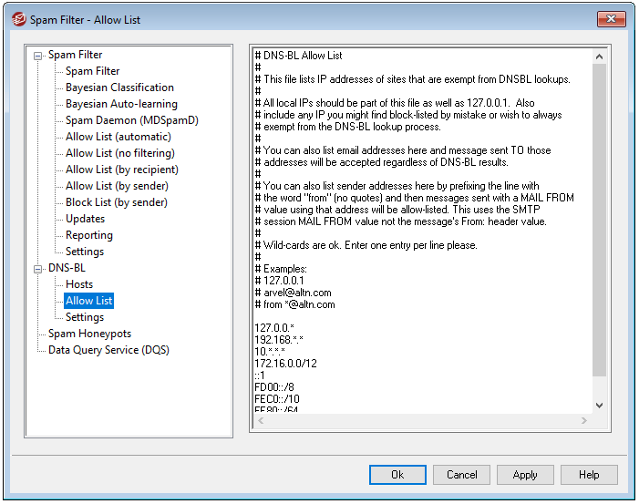 This file lists IP addresses of sites that are exempt from DNSBL lookups. Local domains/addresses should not be on this list.