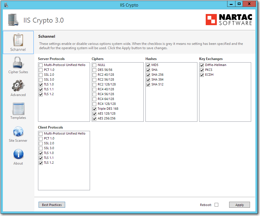The image above is a screen capture of IISCrypto, developed by Nartac Software. This application allows MDaemon administrators to enable/disable security protocols, ciphers, hashes, and key exchanges on Windows 2008 and above in a GUI format.