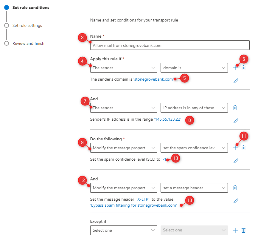 - Set the header to X-ETR and the value to something like: Bypass spam filtering for stonegrovebank.com