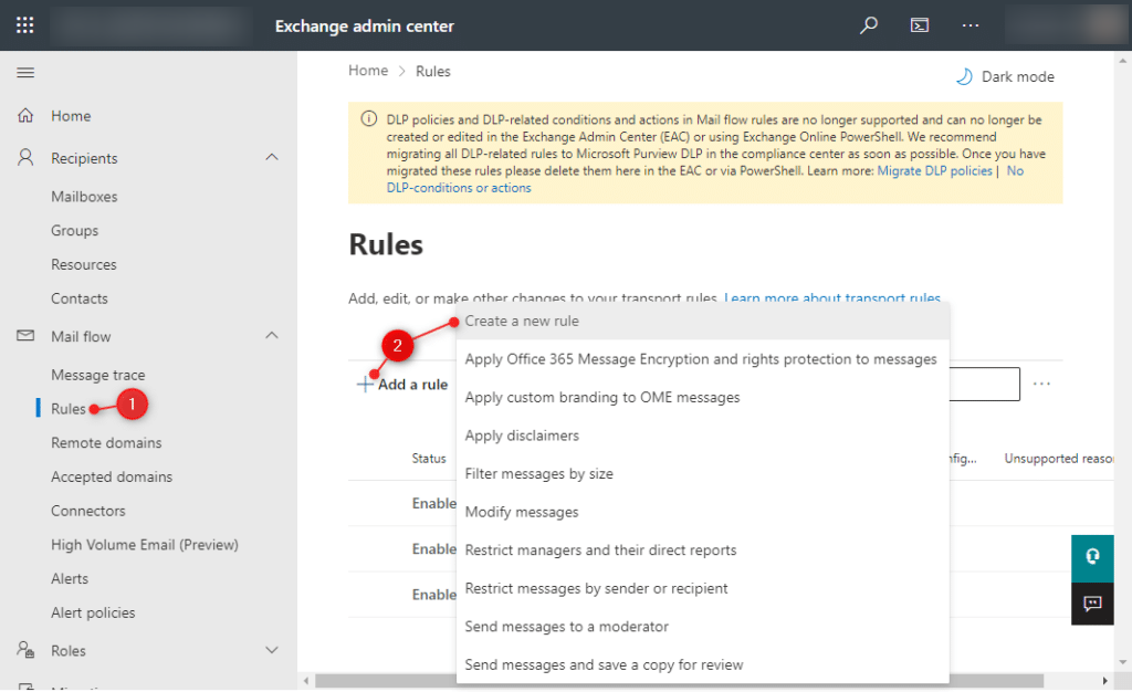 To whitelist a domain with a mail flow rule we first need to open the Exchange Admin Center.