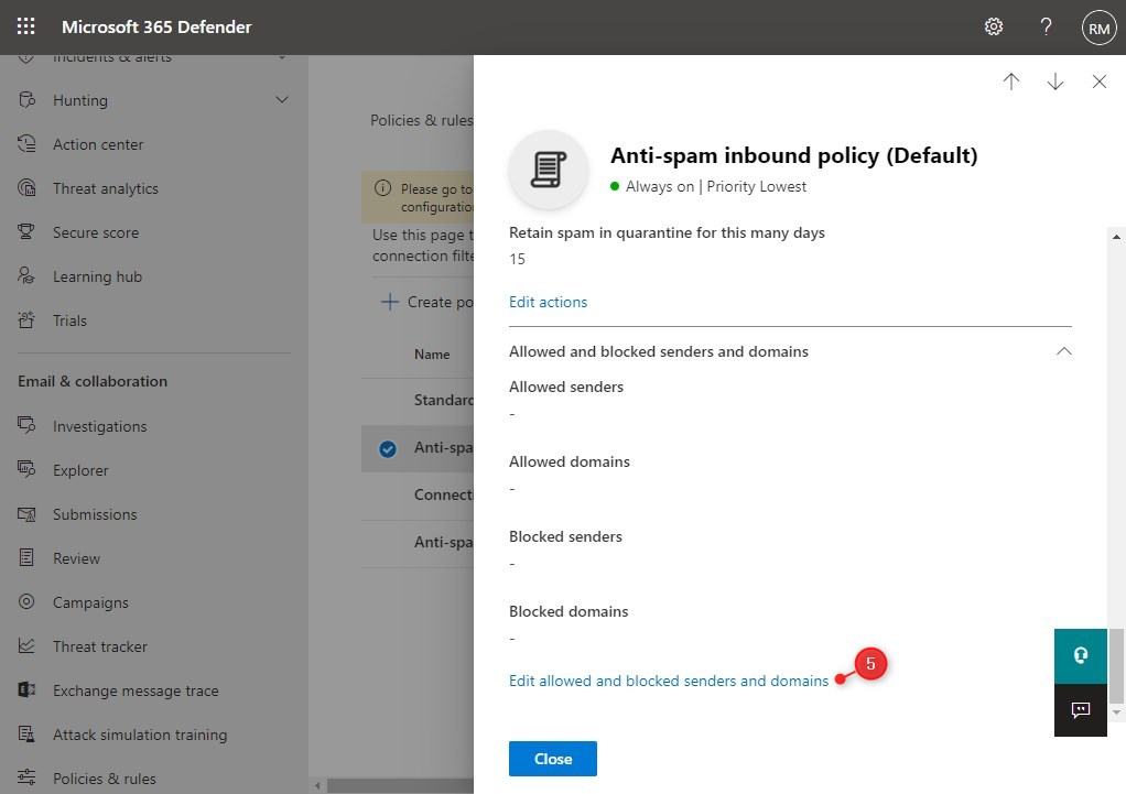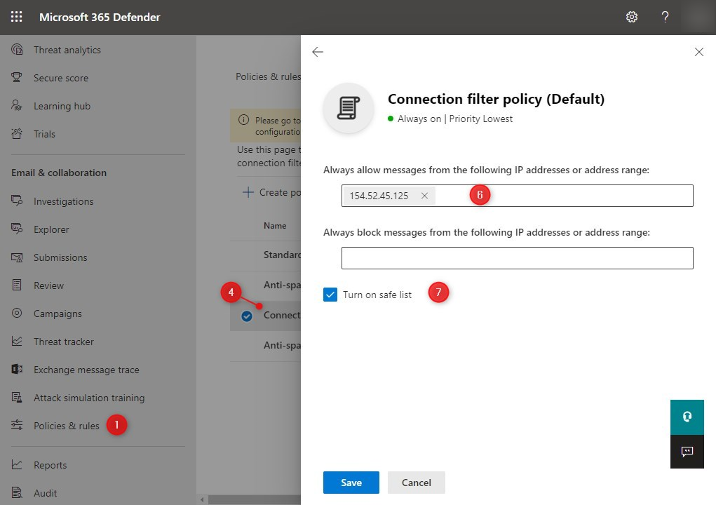 For this, we need to modify the Connection Filter Policy in the security center (Microsoft 365 Defender).