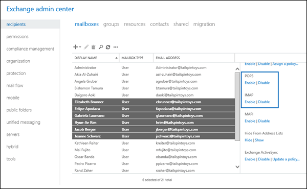 Use the EAC to enable or disable POP3 or IMAP4 access to multiple mailboxes
